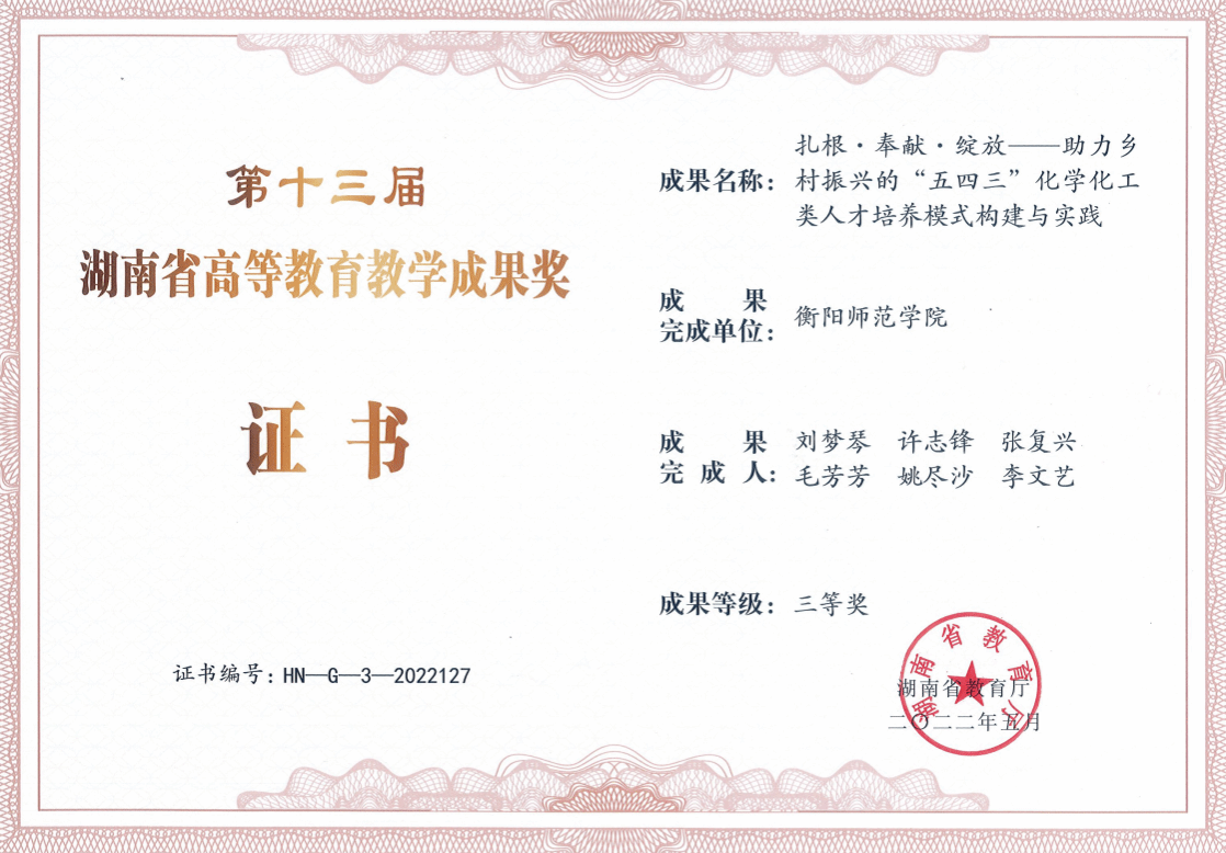 这十年,学院以培养乡村振兴化学化工类人才为目标,提升双创能力为核心,对接教育行业和化工产业,构建并实施了助力乡村振兴的“五四三”化学化工类人才培养模式,培养的人才具有“扎根乡村、奉献乡村、绽放乡村”鲜明特色,取得了系列重要成果。发表教研论文64篇,主(副)编教材7部;获湖南省教学成果奖三等奖2项;“心灵脱贫”教育帮扶团被团中央评为“全国百强传播力团队”;“湖湘红色基因寻迹团”获团中央“镜头中的三下乡”优秀视频团队;“五四三”人才培养模式在新湖南、红网等媒体上进行了宣传报道,对地方高校人才培养具有重大示范和辐射作用。