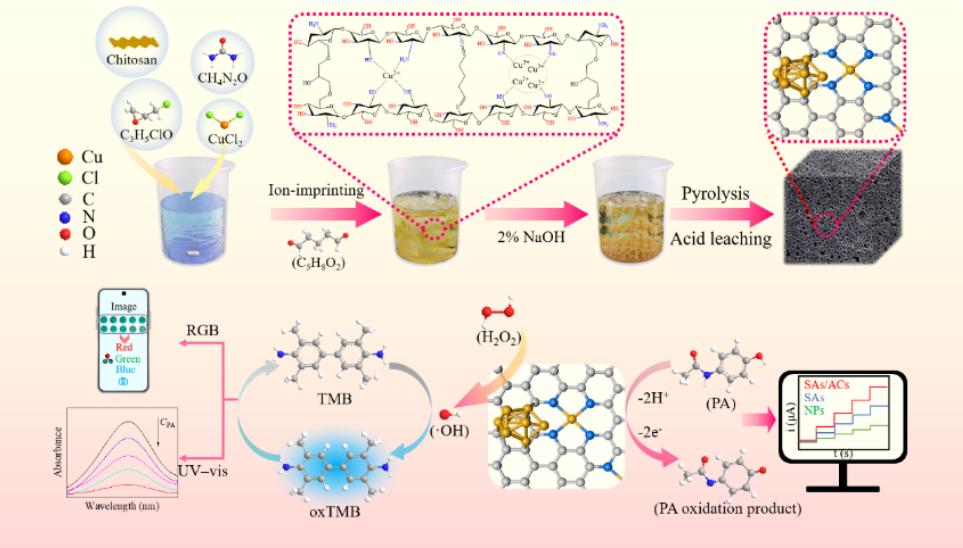 近日,beat365官网2023级材料与化工专业硕士研究生廖辉阳以第一作者在国际知名期刊《Biosensors and Bioelectronics》上发表题为《Ion-imprinting strategy towards a novel two-in-one copper-based nanozyme for sensitive electrochemical-colorimetric dual-mode detection of paracetamol》的研究论文;beat365官网李俊华教授为第一通讯作者,beat365最新在线登录平台为第一署名单位。该研究设计并合成了一种锚定于氮掺杂壳聚糖衍生碳载体上的铜单原子/原子簇结构(CuSAs/ACs@NC),成功构建出一类具有优异电催化与类酶催化活性的新型纳米酶材料。